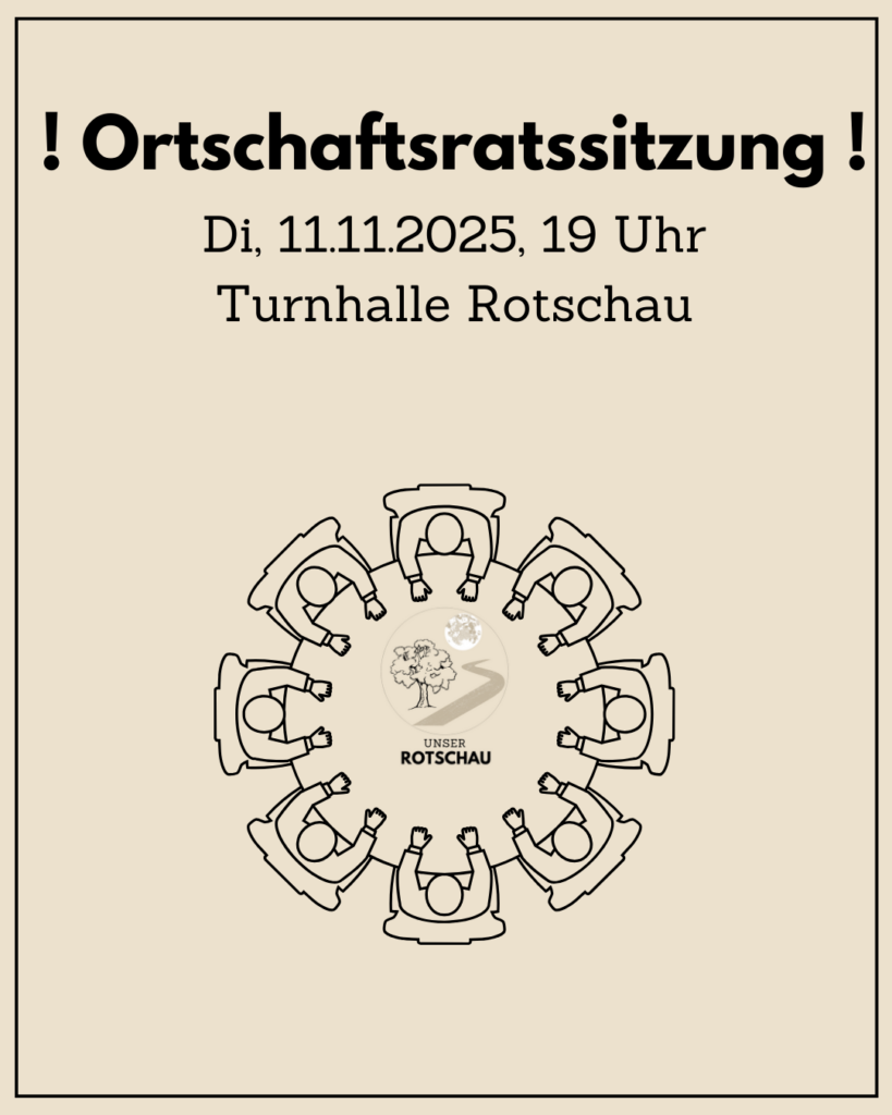 Am 11. November 2025 findet um 19:00 Uhr die nächste Ortschaftsratssitzung in der Turnhalle Rotschau statt. Der Ortschaftsrat freut sich auf Euer Kommen!