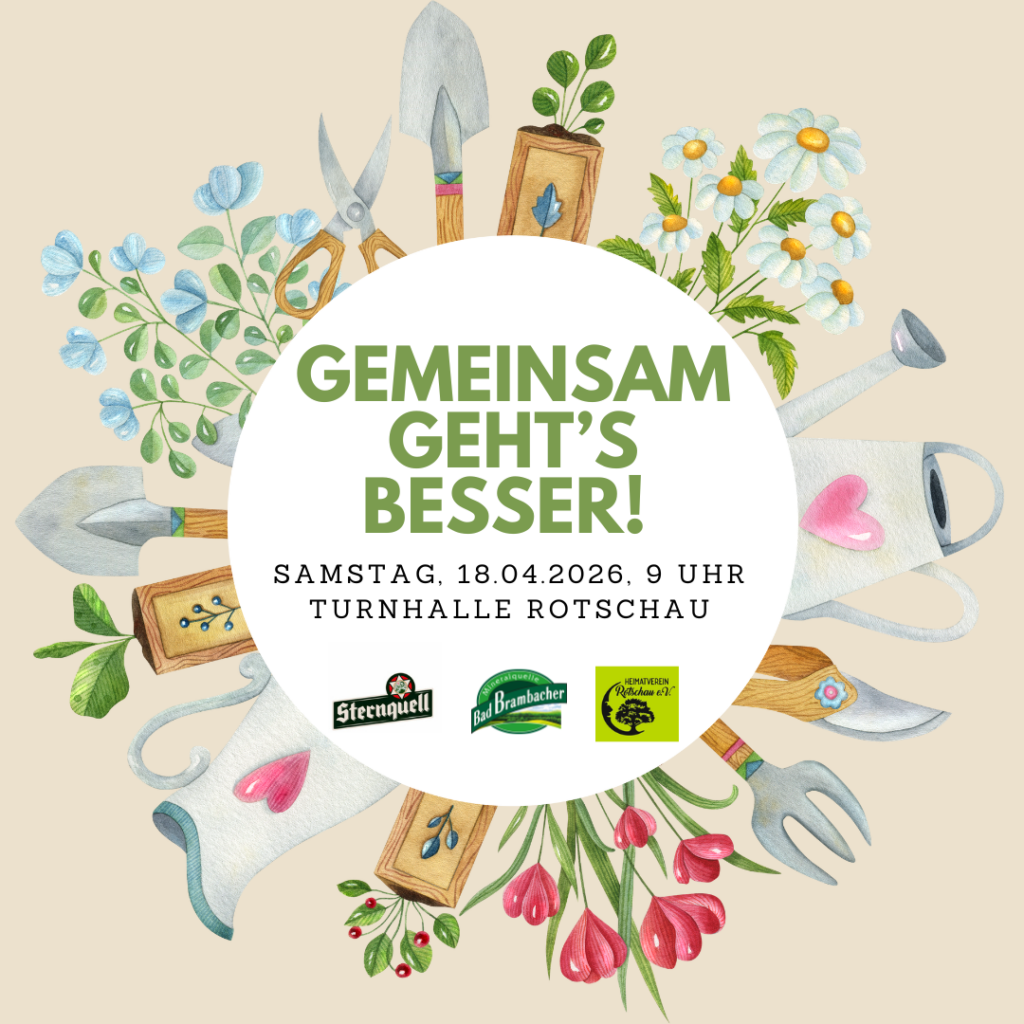 Am Samstag, den 18.042026 heißt es wieder: Gemeinsam geht’s besser. Bei der gemeinschaftlichen Aktion räumen wir zusammen unser Dorf auf und machen unsere Heimat schöner. Treffpunkt für alle fleißigen Helfer ist um 09:00 Uhr an der Turnhalle in Rotschau.